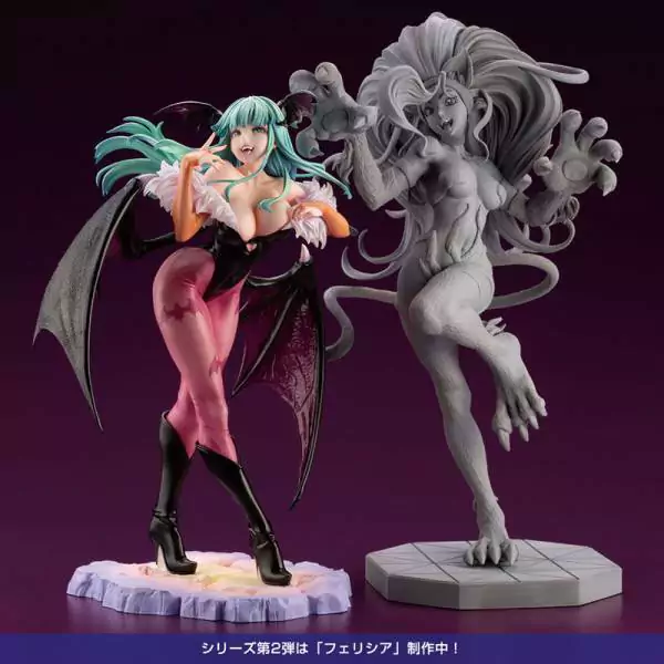 Esses elementos enfatizam a aparência estranha e misteriosa essencial para qualquer personagem DARKSTALKERS. A base é projetada com gradações de cores do estágio de Morrigan no jogo! As qualidades exclusivas de uma reforma da série BISHOUJO brilham nesta figura perigosamente atraente.
